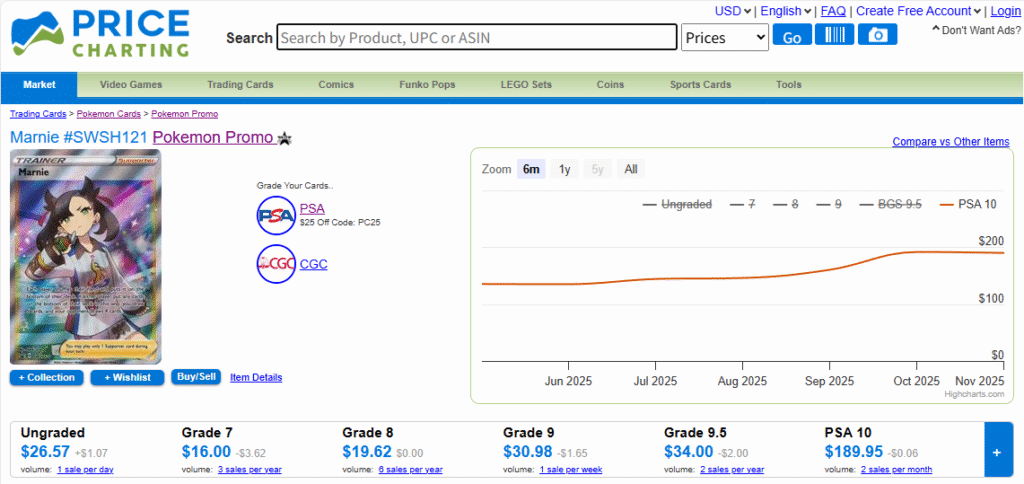PriceChartingは、eBayやAmazonの販売データをもとに作成された価格チャートを提供しており、世界全体での売買動向や需要を幅広く把握できます。このサイトも、海外市場をチェックするうえで非常に便利なツールと言えます。
