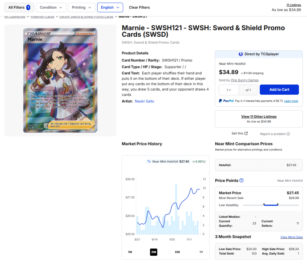 例えば、以下は11月17日時点でTCGPLAYERが提供しているマリィSRの素体のカード価格推移を示した画像ですが、直近3か月で約7%の価格上昇が確認できます。