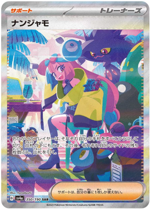 ナンジャモは2023年にイラストの異なる2種類のSARがそれぞれ別のパックで収録されましたが、個人的にはハイクラスパックである「シャイニートレジャーex」に収録されているナンジャモの方がおすすめです。